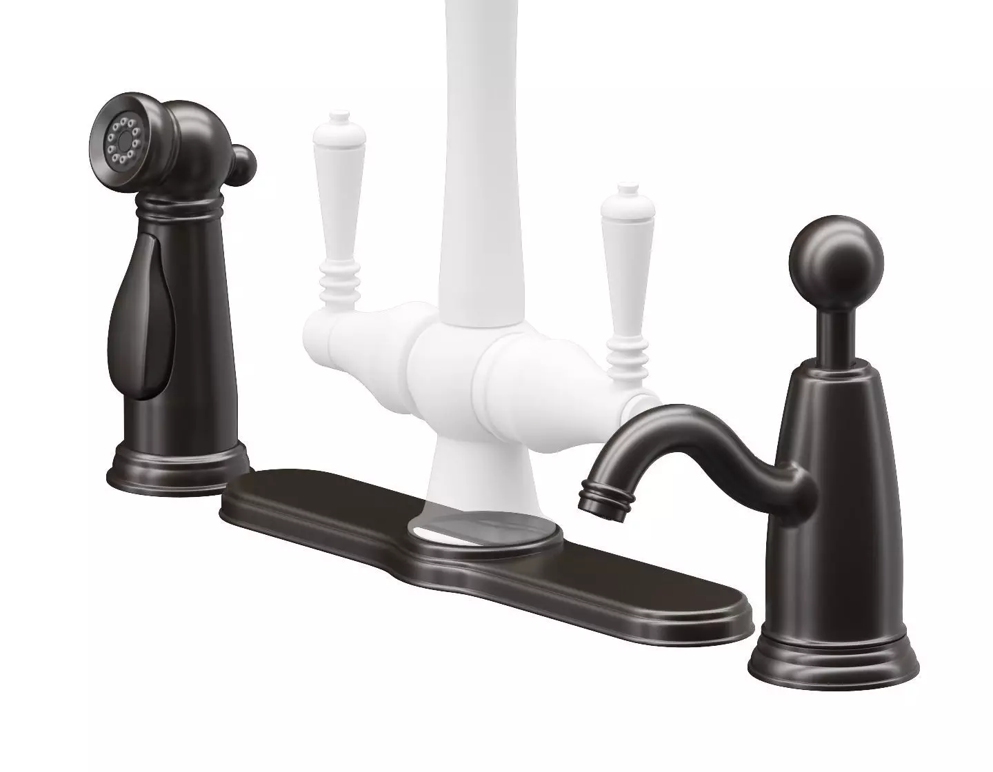 Traditional kitchen side sprayer, soap dispenser, escutcheon (deck plate) in English style. Created in 3ds Max. Models are ready for use in visualization.