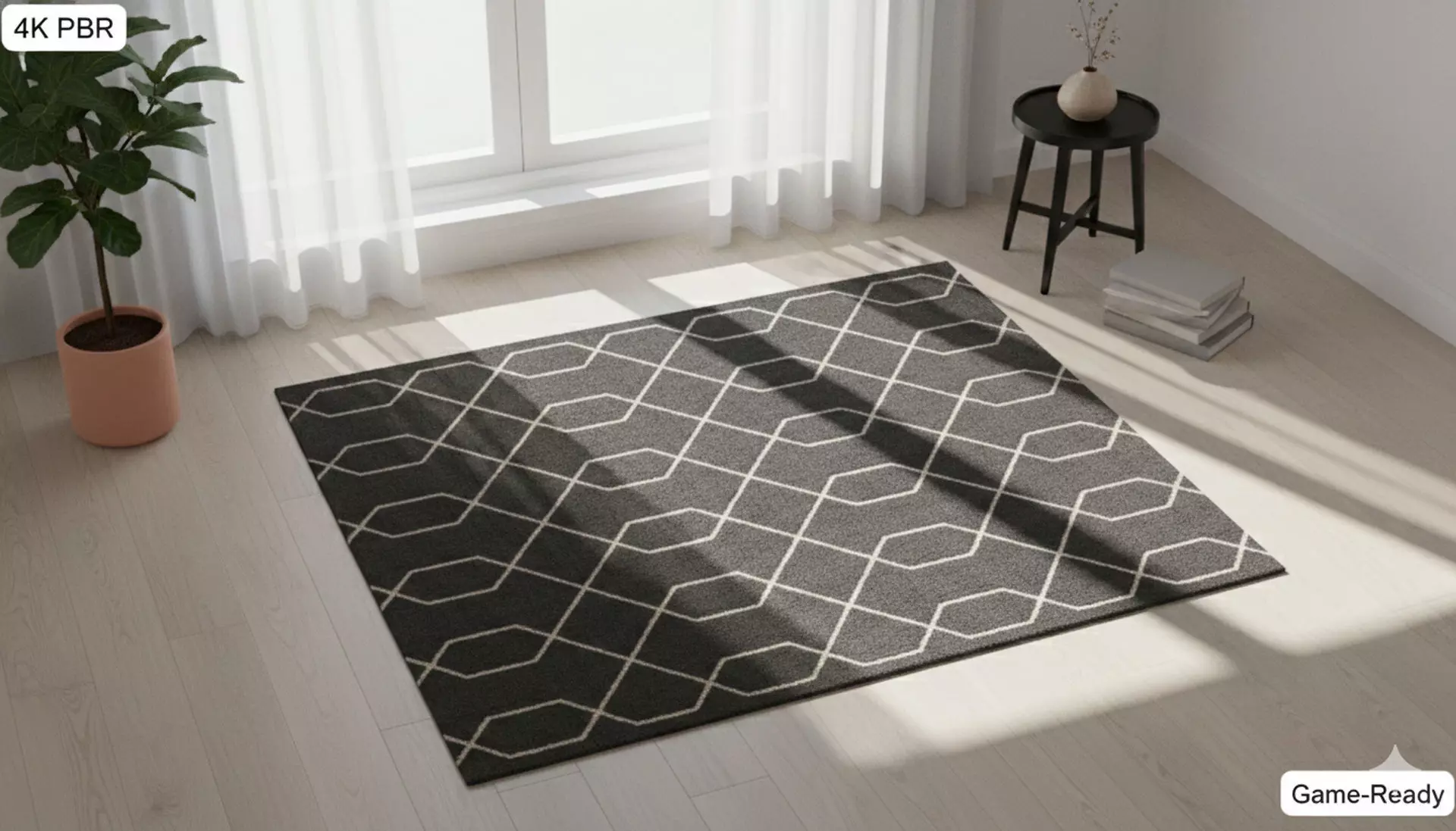 Key Features4K PBR 貼圖:提供極致清晰的細節,包含 BaseColor、Normal、Roughness 等通道,確保地毯纖維在不同光影下呈現出真實的質感。