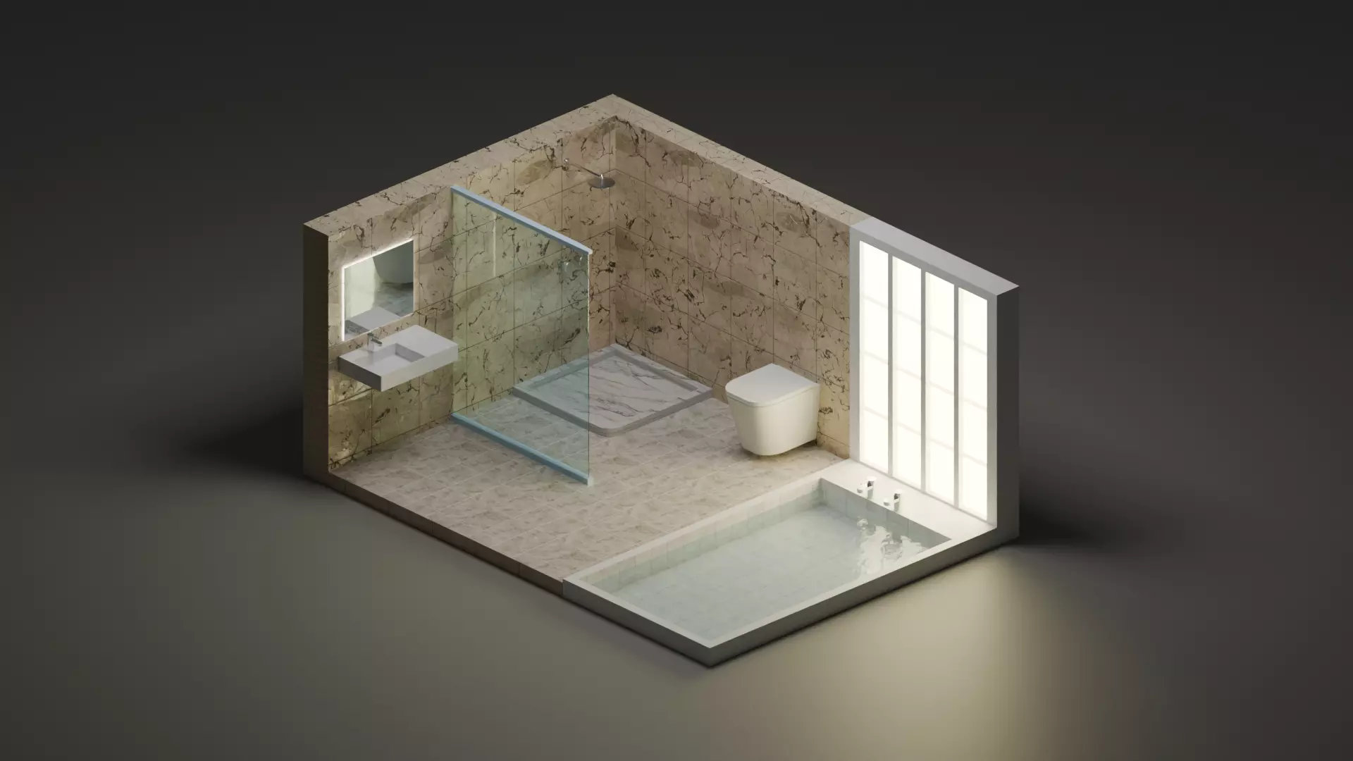 This 3D bathroom model showcases a sleek, modern, and minimalist design. The room features: