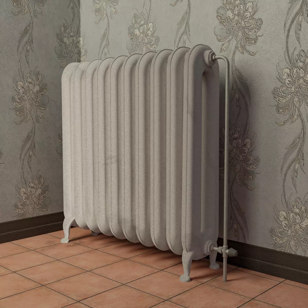An old or antique water-based radiator. Dirty brown metal texture and bump, fixture textures are included; white texture is procedural.