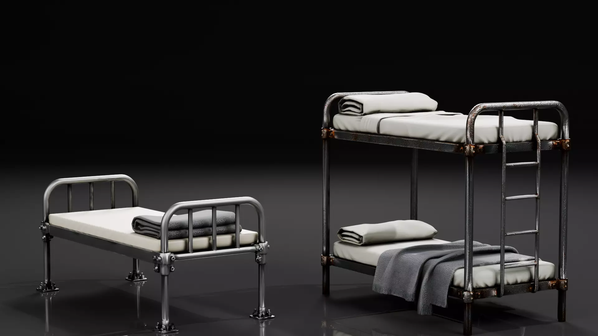 A detailed, realistic 3D model of a standard institutional metal bunk bed, complete with thin mattresses and pillows. This utilitarian piece of furniture is perfect for populating prison cells, military barracks, mental asylums, holding cells, or abandoned horror game environments.