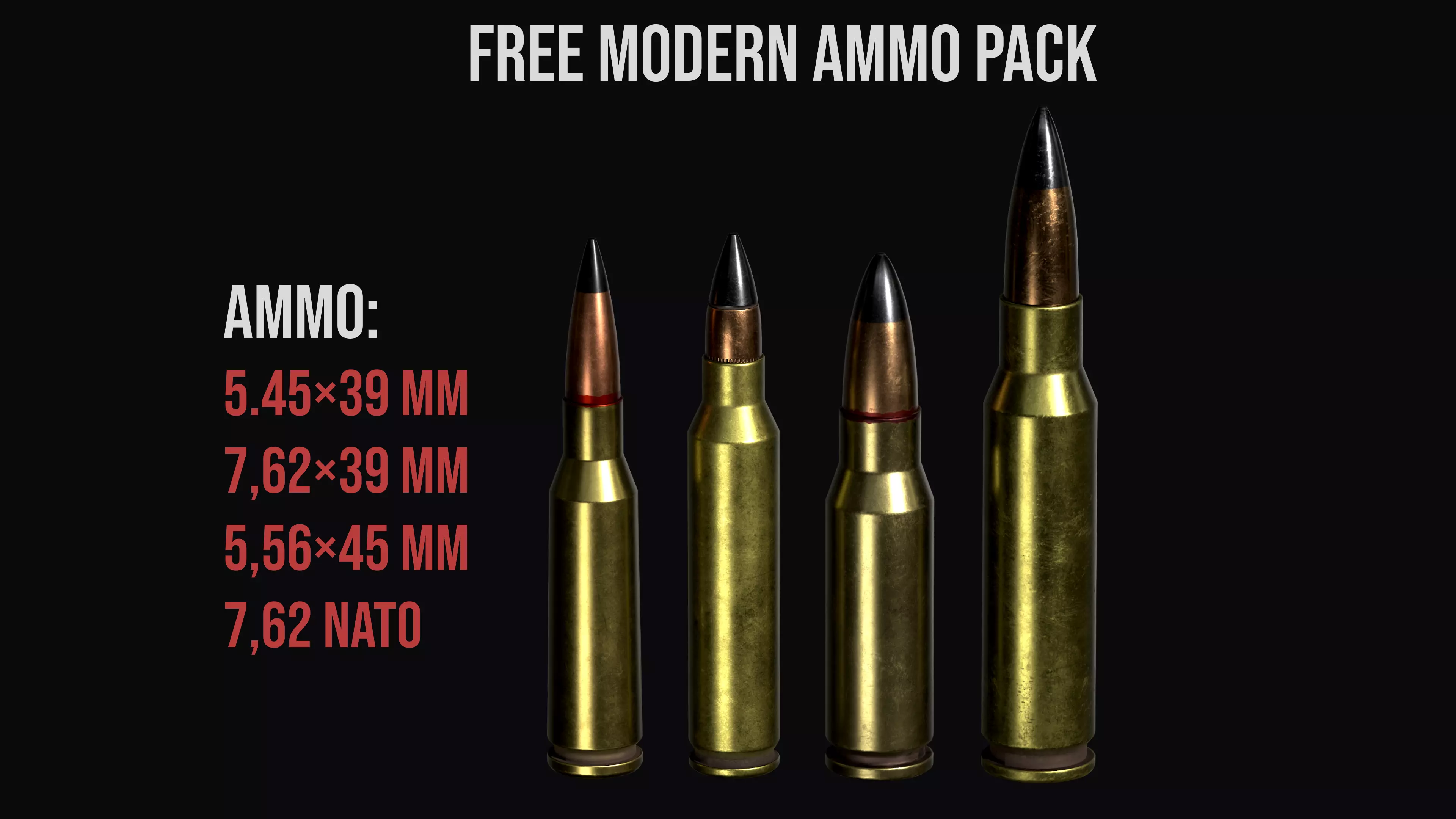 High quality low-poly model modern ammo , created as close as possible to the original with exact dimensions, with highly detailed PBR textures(including textures for Unity and UE5 game engines).Game ready model for PBR game engines, renderers, first Person Shooters, VR games, and your other projects.
