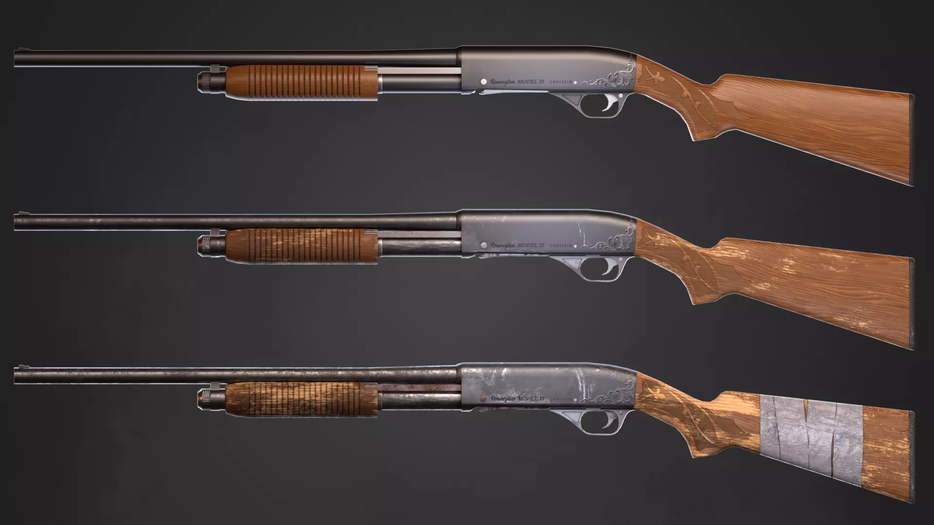 The Remington Model 31 shotgun model.This model was made in 3 states: New; Worn; Old. The model itself between the states has only a visual difference in textures. The topology of the model is the same in all states.The shotgun model also has a reload animation.The model uses 3 PBR textures so far (one pack for each state).