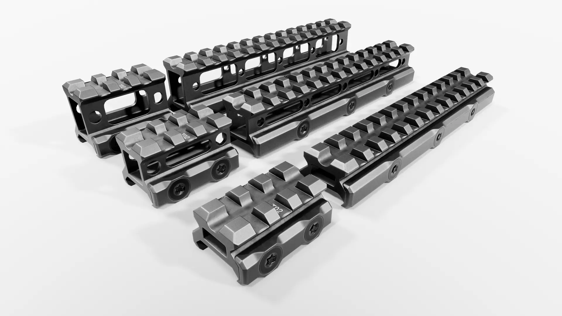 Game ready models of the UTG Super Slim Picatinny Riser Mounts.