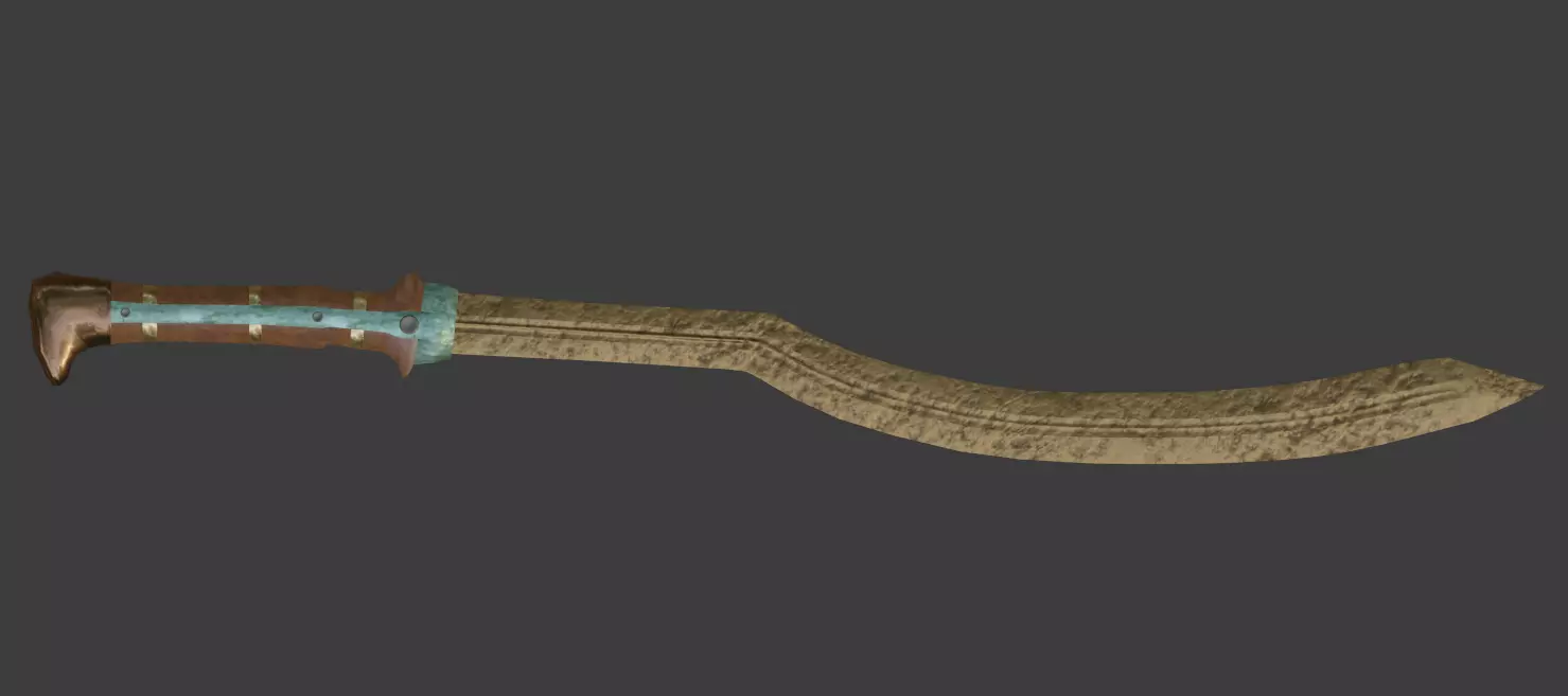 Ancient crescent sword, which name is khopesh. Sharpened from two sides of blade. Handle is fastened with rings and patina plates. It can be used in games or ancient reconstructions. Main materials are: bronze, bronze patina, processed wood, gold, copper. The model does not content a lot of faces. Textures are taken from open source https://www.textures.com