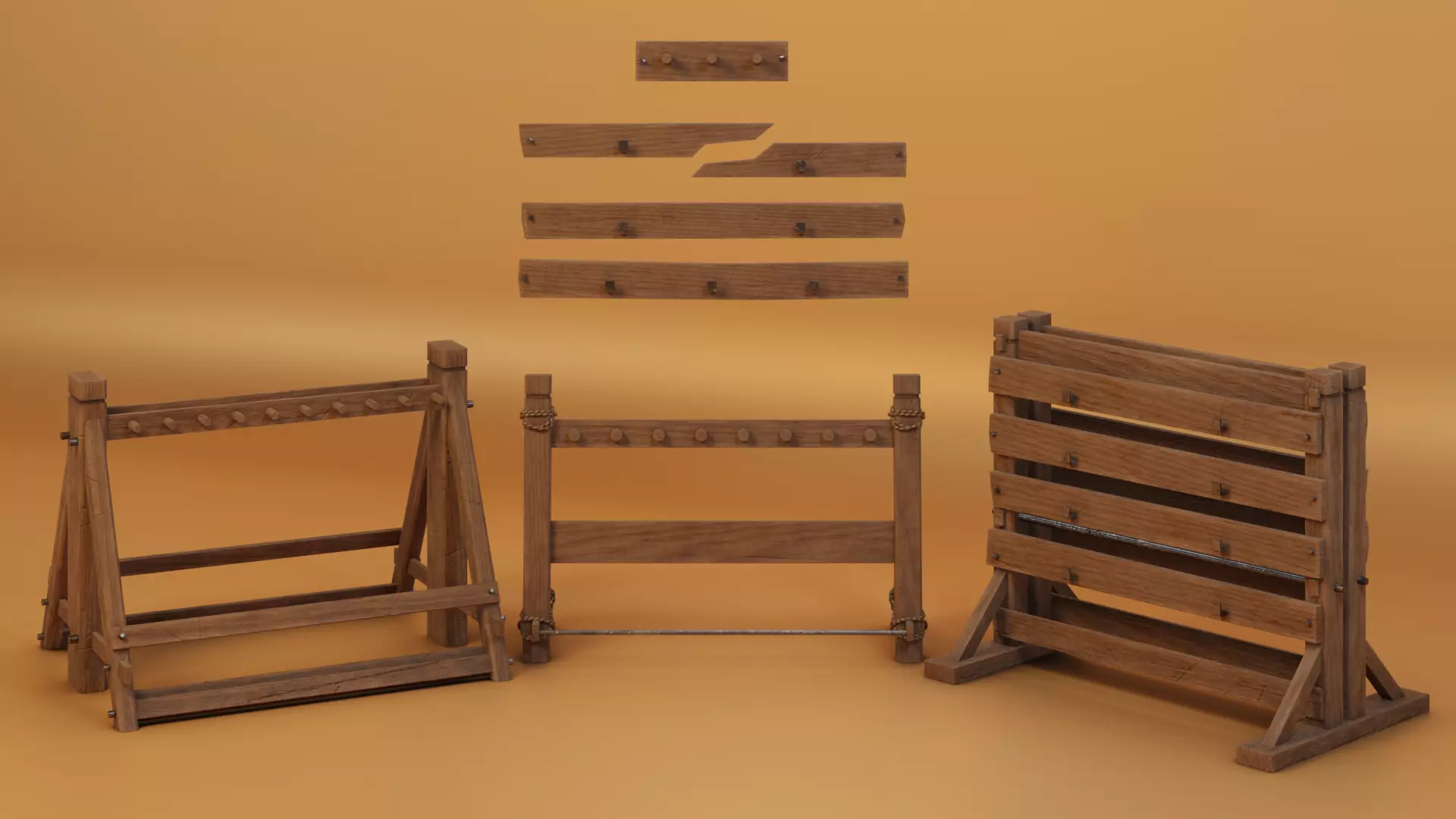7 medieval wooden Weapon Racks perfect for your fantasy, rpg, strategy or other medieval games or projects. Modeling with blender, texturing with Substance Painter. Every Model has an continuous Wood Grain Texture.