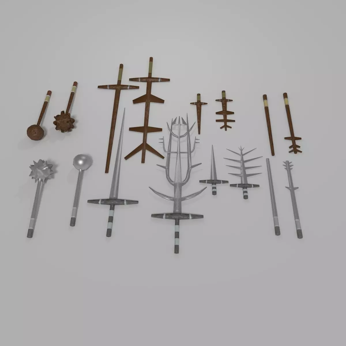 Stick 1 Wood -- Verts - 52, faces - 47, tris - 94 Stick 1 Metal -- Verts - 52, faces - 47, tris - 94 Dagger 1 Metal -- Verts - 152, faces - 147, tris - 294 Dagger 1 Wood -- Verts - 124, faces - 119, tris - 238 Sword 1 Metal -- Verts - 152, faces - 147, tris - 294 Sword 1 Wood -- Verts - 124, faces - 119, tris - 238 Mace 1 Metal -- Verts - 138, faces - 133, tris - 266 Mace 1 Wood -- Verts - 138, faces - 133, tris - 266
