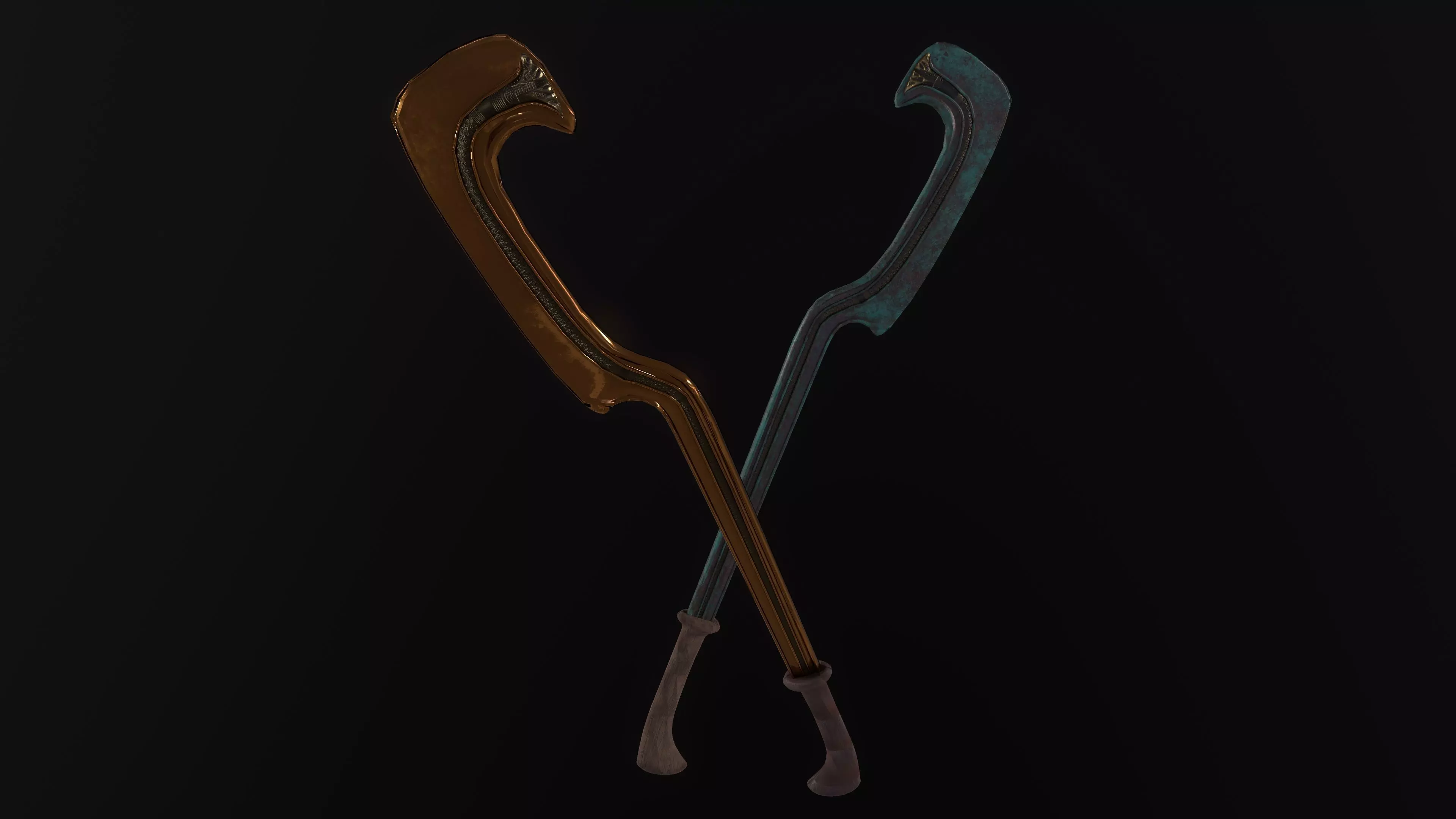 The khopesh was an early sword form originating in ancient Egypt. It was a sort of midpoint between an axe and sword, with the shape of the blade emulating the center of mass that comes with an axe while maintaining the weight of a sword. It’s most commonly known as an Egyptian weapon, but was also used in the Canaanite city-states located in modern day Israel and neighboring countries. This rendition is based on one such Canaanite specimen, found in Nablus, Palestine. It was likely to serve a symbolic role rather than practical, as the blade is beautifully inlayed with a silver-gold alloy known as electrum. It’s dated to about the 18th century B.C.E, making it over three thousand years old. As far as a multi-millennia artifact, it’s remarkably well preserved, with the inlay still untarnished and the blade mostly intact. The handle and part of the tang has dissolved, however, and so this rendition uses a handle based on the handles of similar specimens.