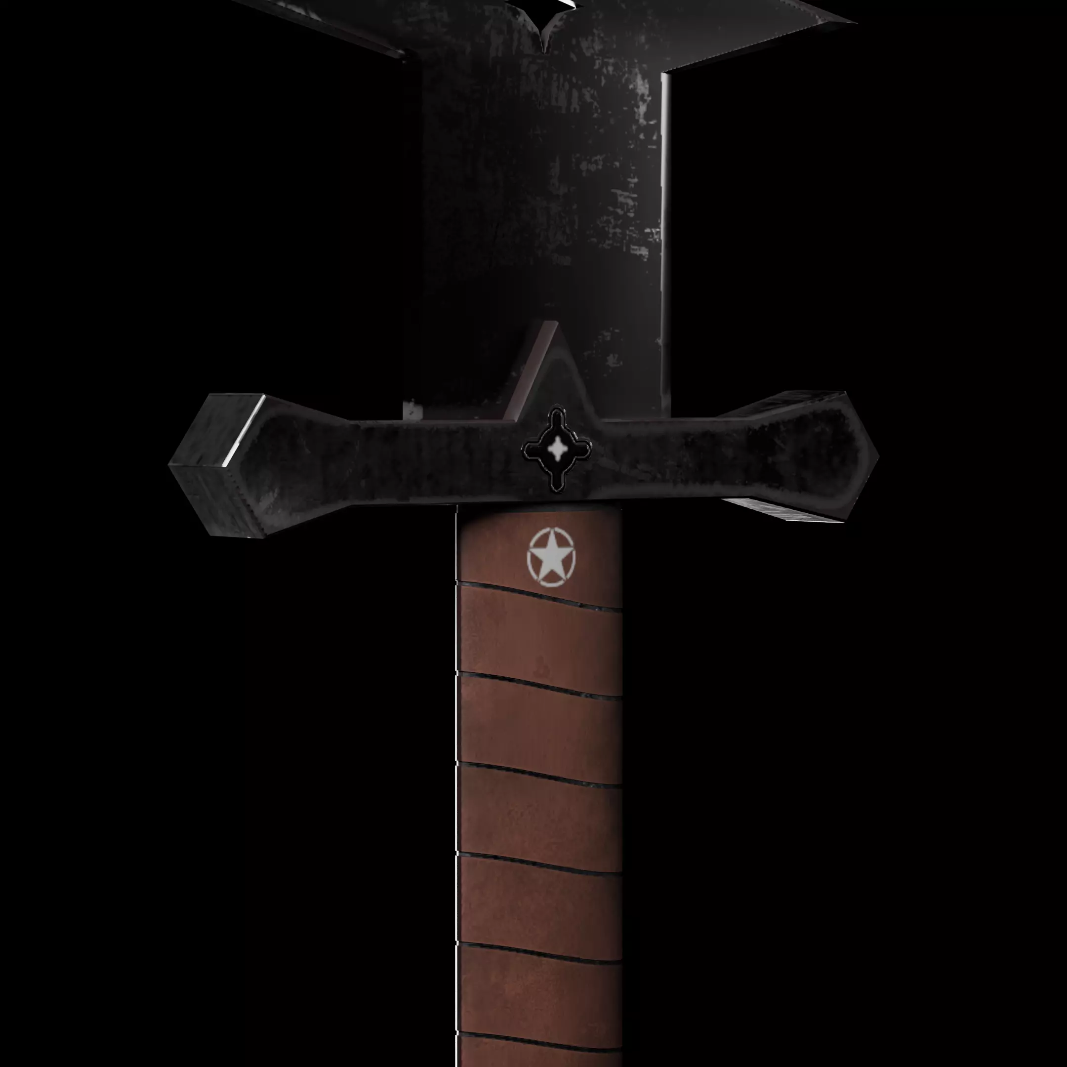 This is a high-quality medieval fantasy greatsword 3D model, created in Blender and textured in Substance Painter. The sword features a dark steel blade with a cross-shaped cutout, a detailed crossguard, and a leather-wrapped handle for a realistic yet stylized look.