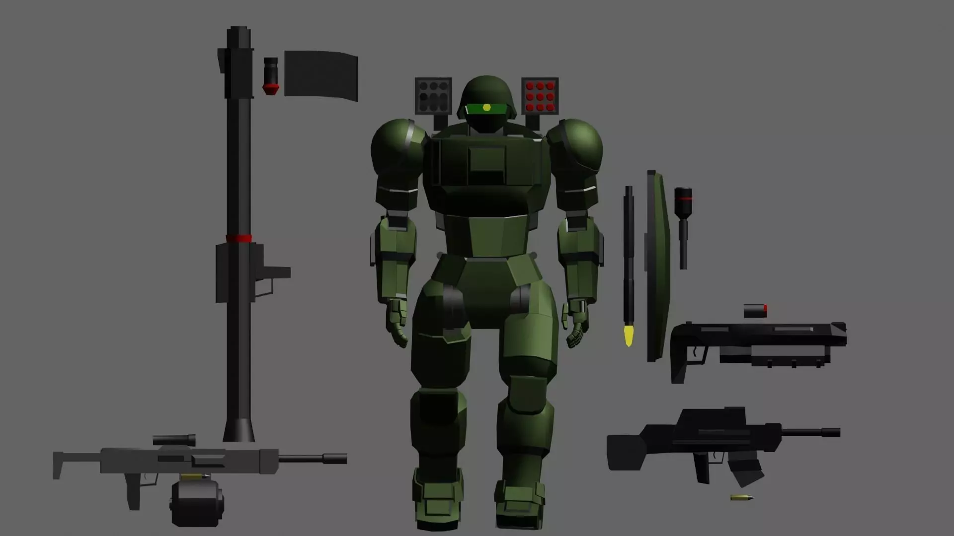This model comes with several weapons and equipment which also consist of separate parts as to be animated easily (Read text within Blend file for explanation of rig and functions). A simple walk animation is included but note that it is not refined as I pulled the rig from another model of mine but thought to included it to give you a head start. The mech model itself is under 6000 faces and just over 10,000 with all accessories.