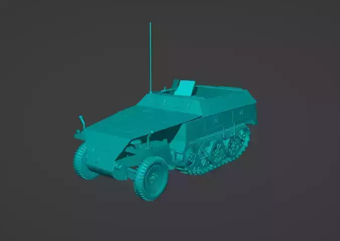 Rar file include 14 STl file. (antenna left,antenna right,foothold left,foothold right, front chassie, horn???,mg turret, radio antenna top,sdkfz250 , steering wheel, track left , track right ,wheel left and wheel right).