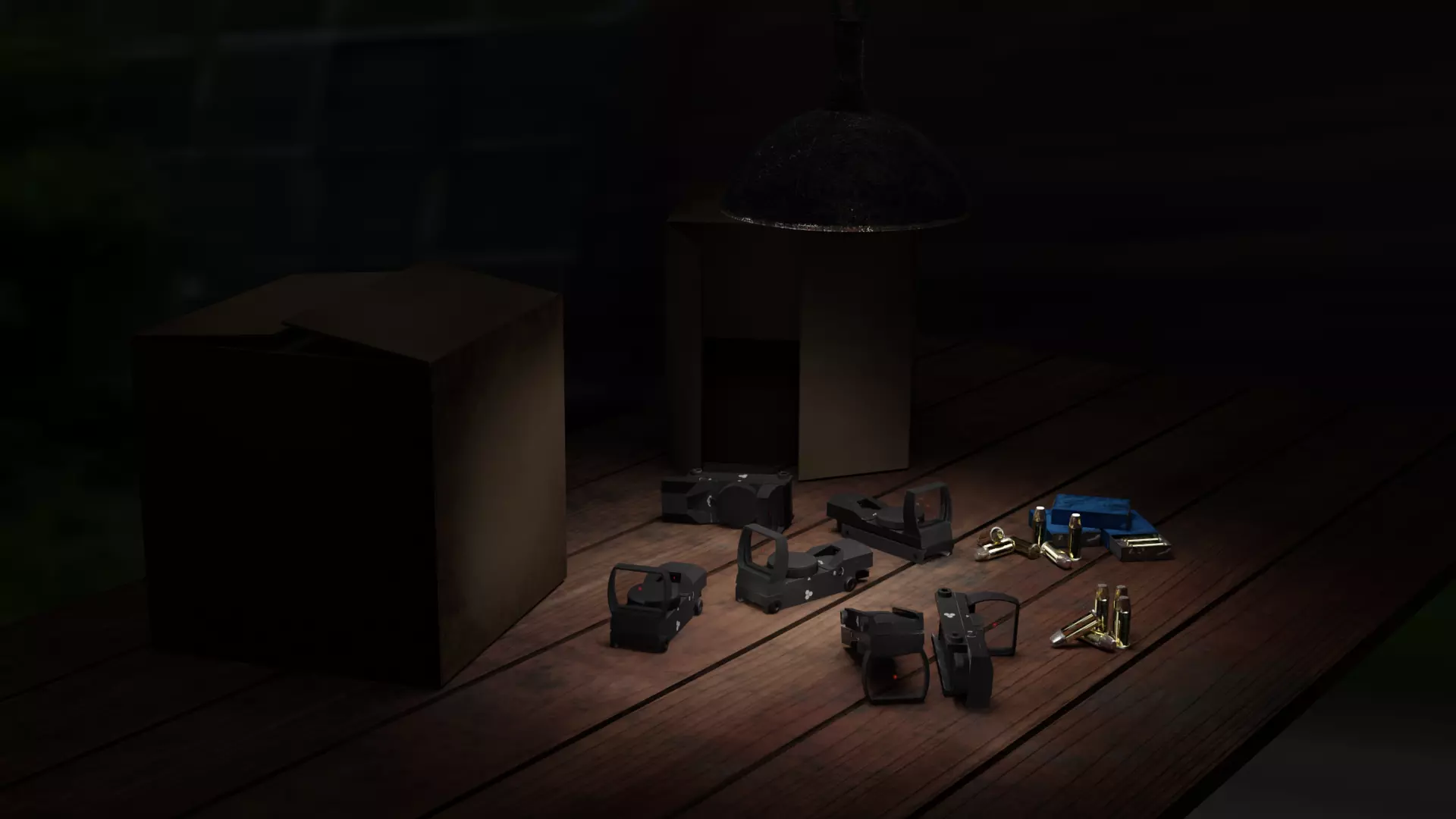 #Assets*Reddot scope*Ammo*Ammobox*Cardboard box*Wodden table