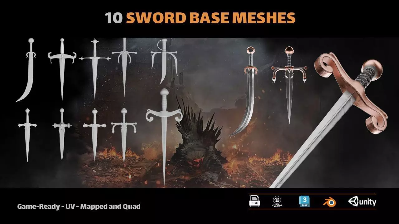 Elevate your projects with this meticulously crafted pack of 10 medieval sword base meshes. Designed for 3D artists, game developers, and hobbyists, this collection provides a versatile foundation for your creative endeavors. Each model is optimized for performance and ease of use, allowing for seamless integration into your workflows.