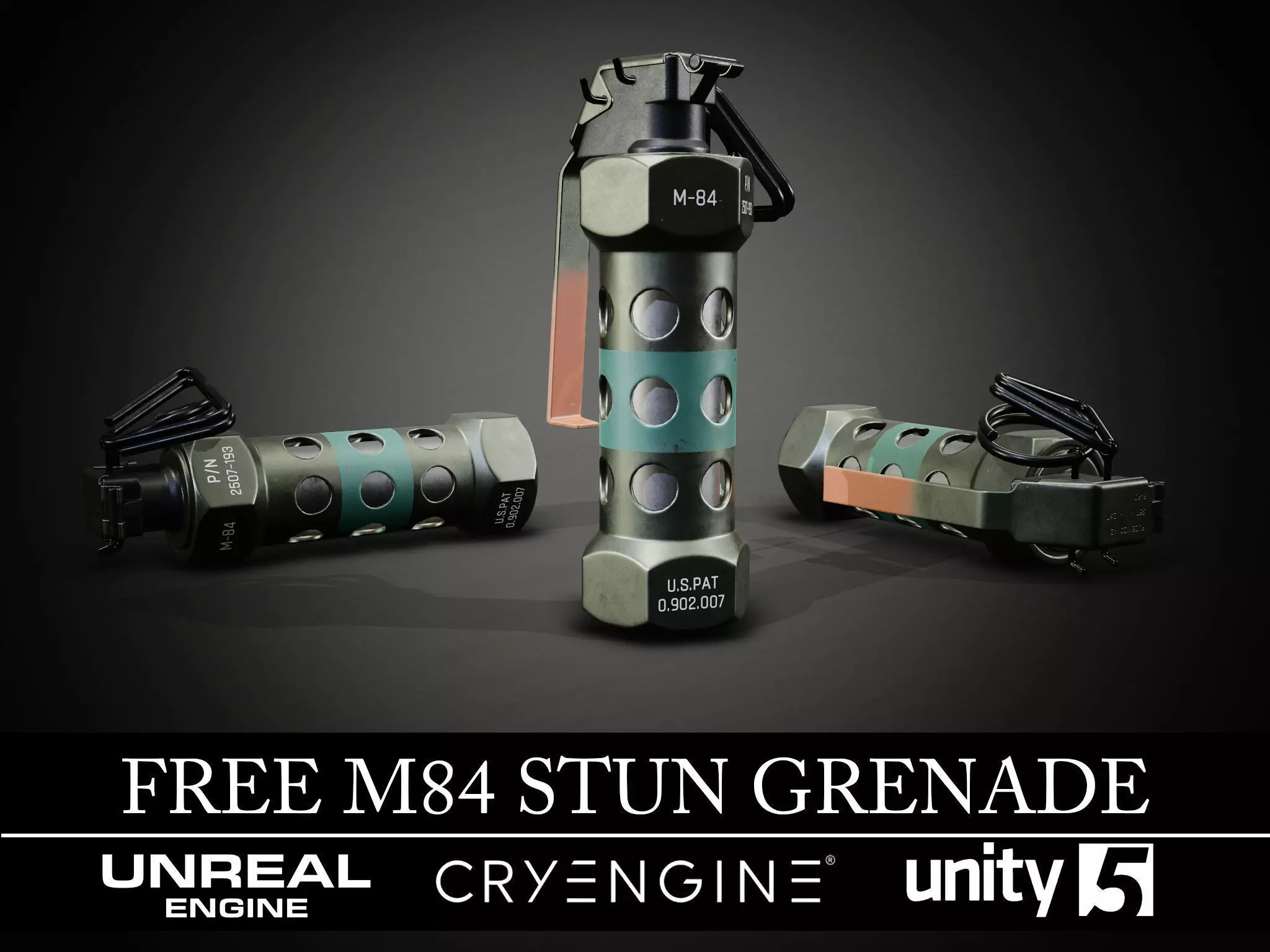 Free of charge, M84 Stun Grenade as used by the US military – Lowpoly model and Textures for realtime (inGame) use. Can be used for VR/AR aswell. Not inteded for subdivision.