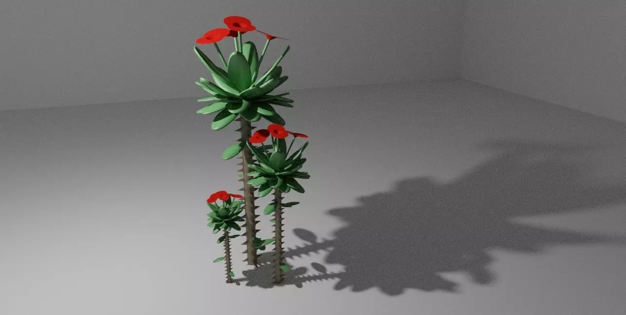 Crown of thorns (Euphorbia milii) is a thorny ornamental plant from Madascar, receives its name due to the crown of thorns that Jesus Christ used at his crucifixion and can grow up to 5 ft. They are characterized by having a stem full of thorns and having red flowers in most of the cases.The model consists of 3 plants of the following scale sizes:Plant 1: 20 inPlant 2: 12 inPlant 3: 8 in