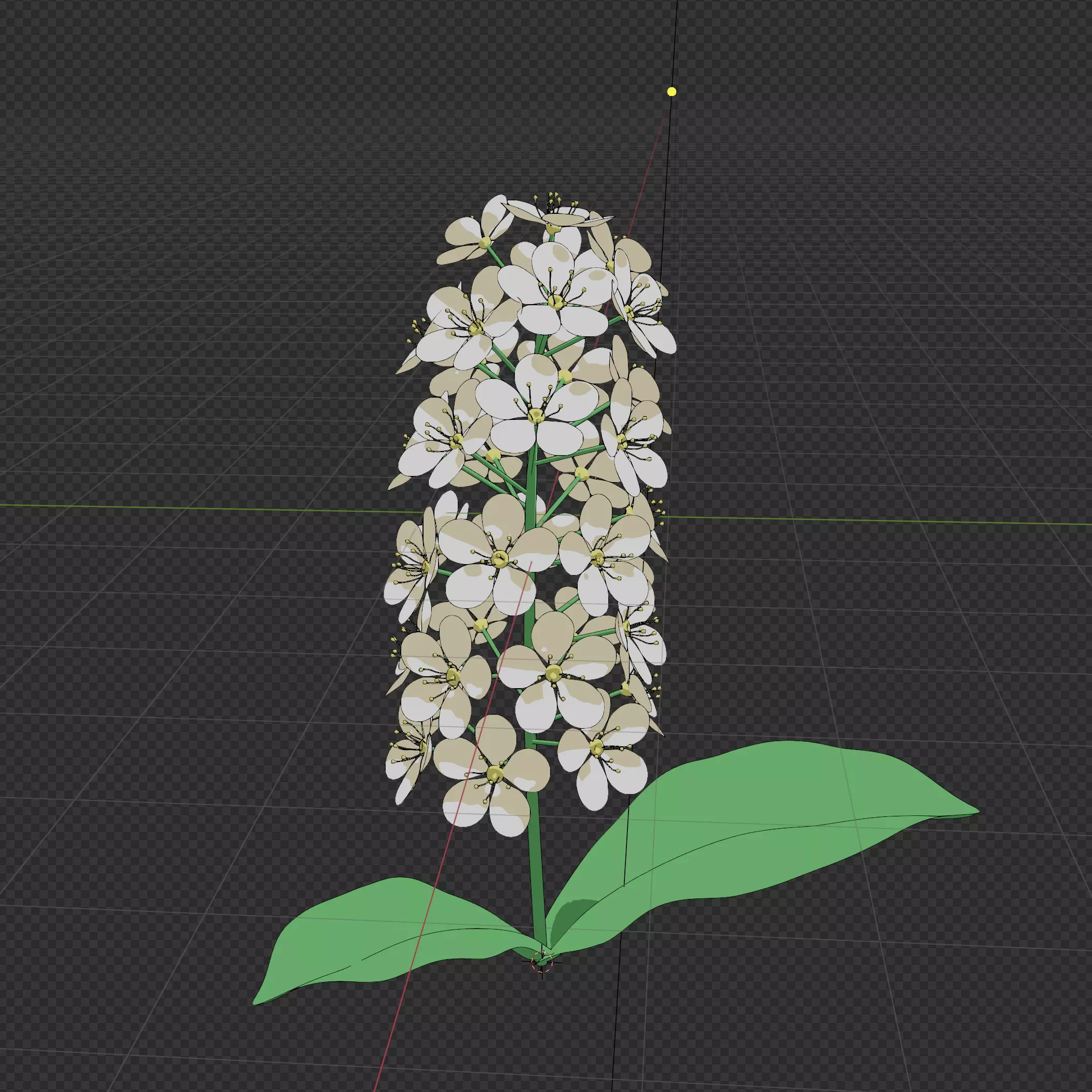 This is a highly detailed high-poly 3D model of a chokecherry (Prunus virginiana) flower cluster, ideal for realistic renders, botanical illustrations, and nature-themed projects. The model is non-manifold, making it best suited for static renders, illustrations, and pre-rendered animations rather than real-time applications.