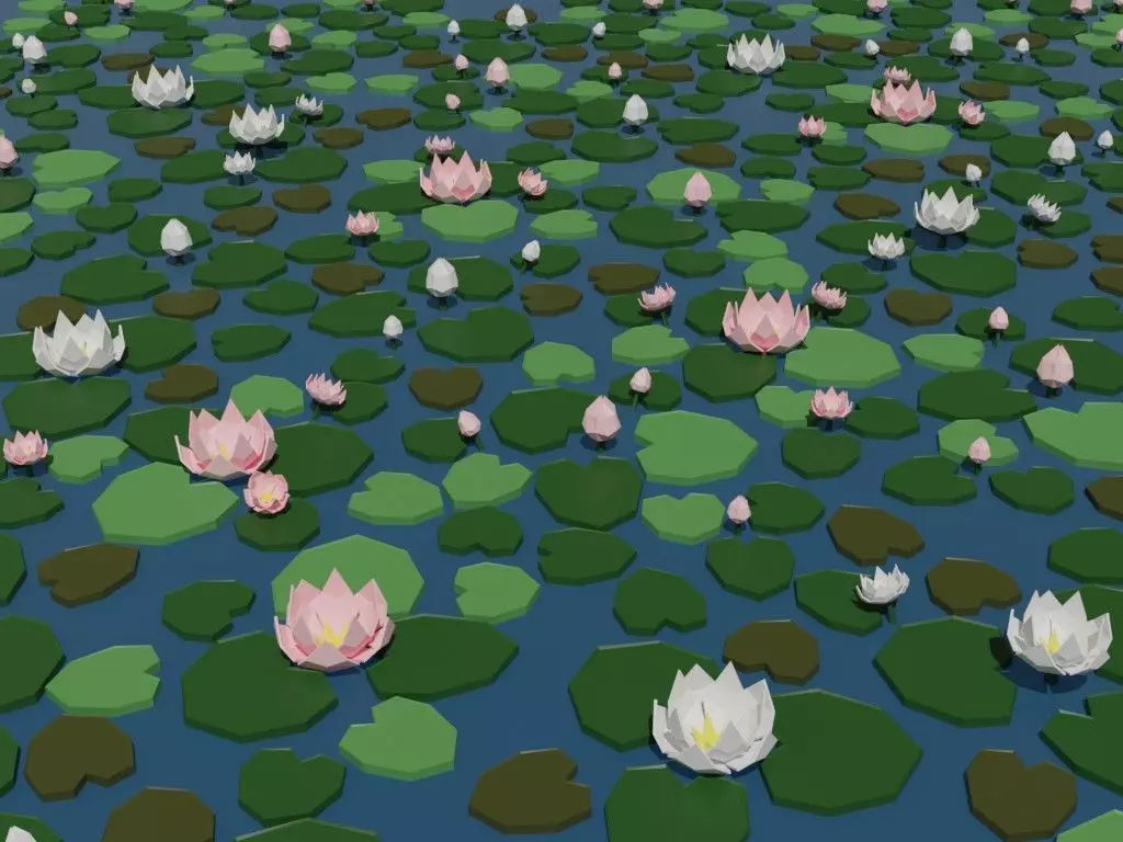 A set of water lilies, contains 8 objects: 4 types with open buds and 4 types with closed buds. Suitable for decorating the shores of lakes, rivers or ponds. The texture atlas is in < texture.zip >.