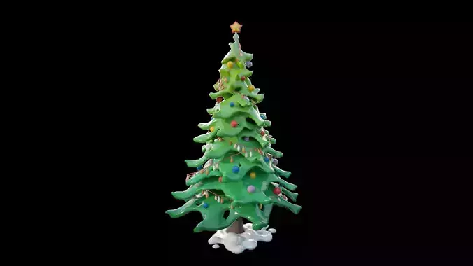 This is a stylized low-poly Christmas tree 3D model designed for games, animations, illustrations, and festive scenes. The tree features exaggerated, soft, rounded layers of branches arranged in a playful, cartoon-like silhouette. Decorative elements such as colorful ornaments, light garlands, and a star topper are integrated directly into the design, giving it a cohesive and readable form from any angle. A small snow base around the trunk adds seasonal context and visual grounding.