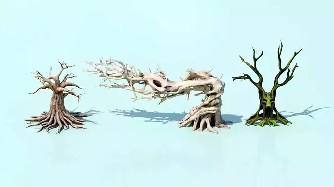 This set includes three unique snow-covered tree models designed for use in games, animation, cinematics, environment design, and visual storytelling. Each tree features a stylized, sculptural form, combining natural wood structures with thick, soft layers of winter snow. The shapes range from twisted and eerie silhouettes to wide, root-spreading trunks, making the collection suitable for both realistic and fantasy scenes.