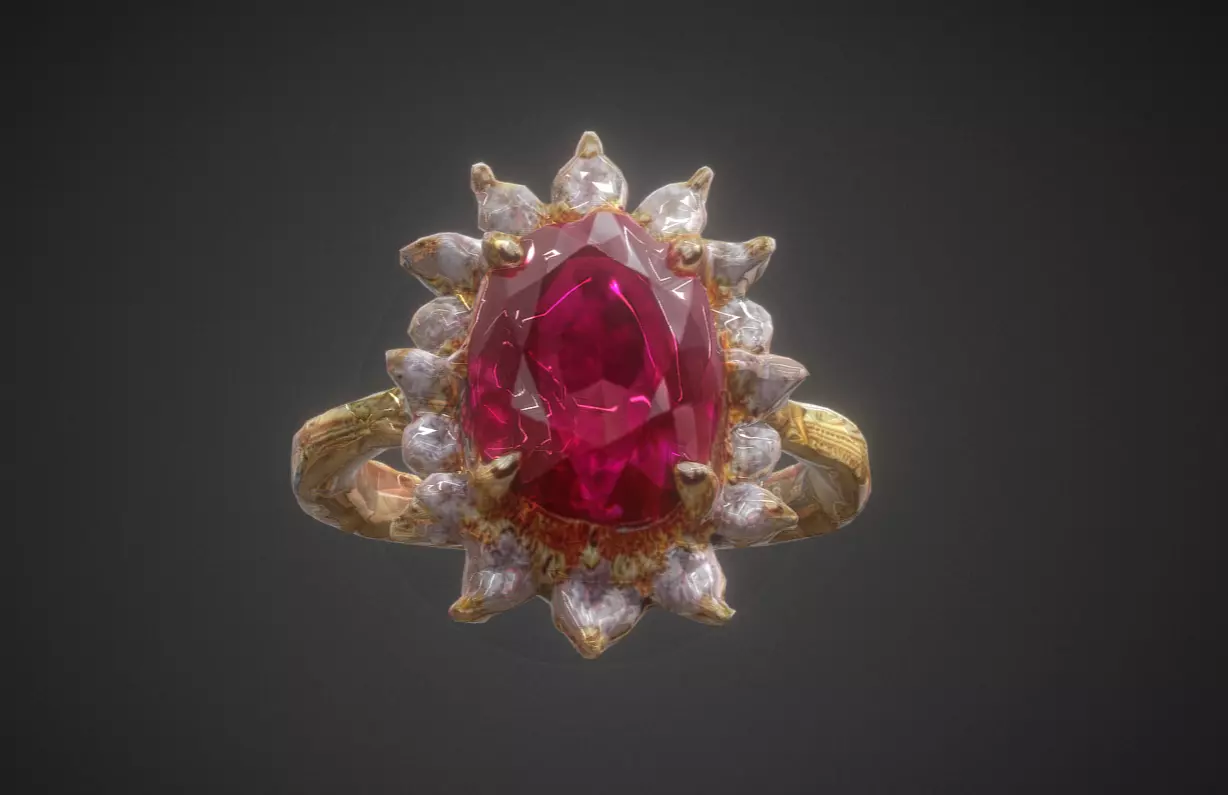 An exquisite piece of jewelry that brings a touch of luxury and elegance to any virtual environment. It features a vibrant ruby surrounded by sparkling diamonds, set in a finely detailed band. Ideal for character and avatar accessories in games.