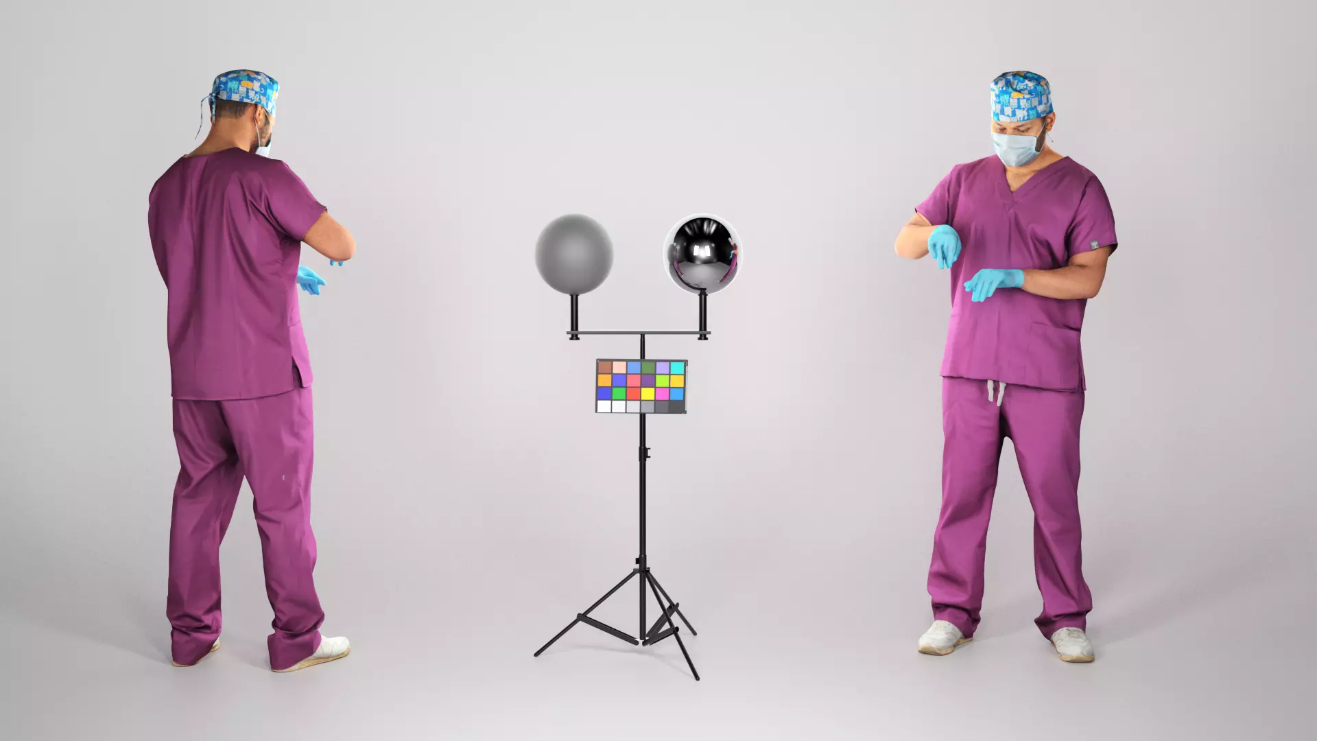 This is a true human size and detailed model of a young man of African appearance dressed in a uniform of a surgical doctor. The model is captured in casual pose to be perfectly matching to variety of architectural visualization, background character, product visualization, e.g. advert banners, professional products/devices presentations, VR/AR content etc.