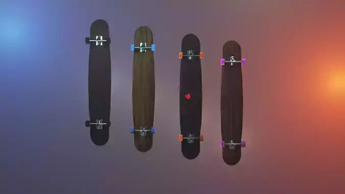 2.) Baked Texures:LONGBOARD_2K/LONGBOARD_2K - textures for the material setup (BOARD-6 diffuse maps, 1 normal map; TRUCKS- diffuse, metallic, normal, roughness map; WHEELS- 4 diffuse maps, normal and roughness)UV - the folder contains png pictures with a default UV mapping (for wheels, trucks and the deck sparately)