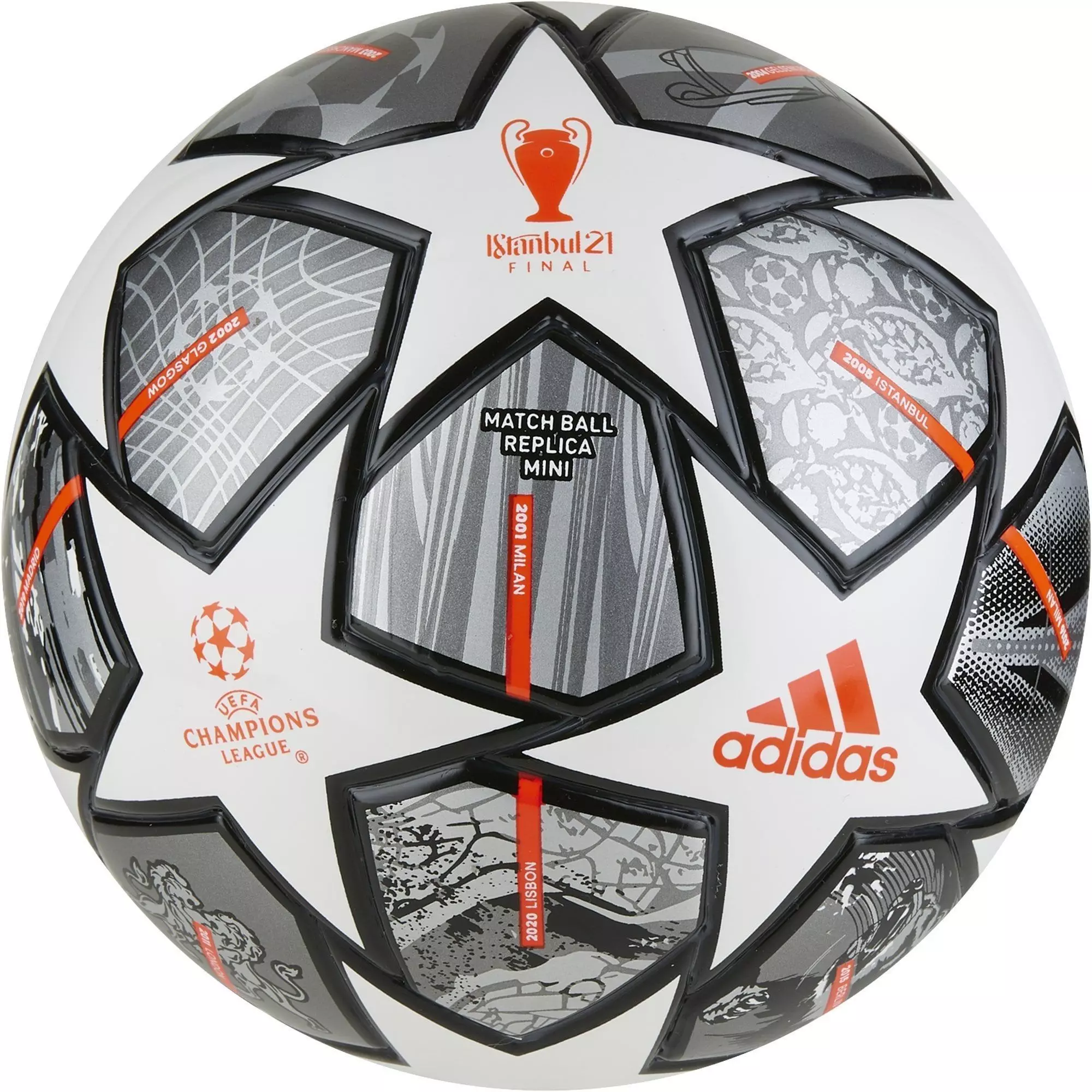 of 1:0. The ball reflects all the cities in which the Champions League final was held over the past twenty years. The design of the ball is