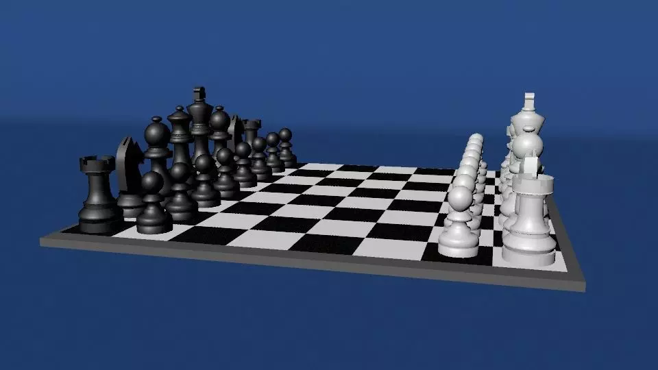 Chessset made in MAYA 2019.Pawn, rook, knight, bishop, queen, king and unicorn chess pieces and a board.