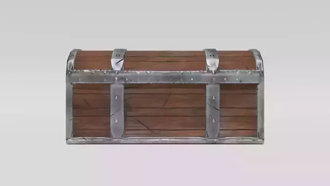The chest is made primarily of dark brown wood with a natural grain texture. The wood is enhanced with visible lines and marks, adding a rugged and aged aesthetic.Silver or metallic straps surround the chest, providing structural support and a robust appearance. These straps are riveted with round metal studs for additional reinforcement and a decorative touch.