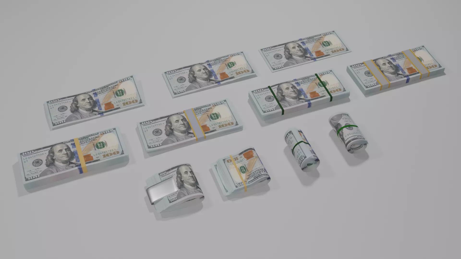 Collection of 100 american dollars.faces-723295.vertices-783346.100$ seventy five bills.001-vertices-252.989 faces-244.544100$ seventy five bills.003-vertices-146.379 faces-136.704100$ seventy five bills.002-vertices-146.059 faces-136.384100$ seventy five bills-vertices-146.763 faces-137.008100$ one hundred bills.001-vertices-6.552 faces-5.052100$ fifty bills-vertices-19.052 faces-17.052100$ one hundred bills.003-vertices-29.340 faces-26.040 100$ one hundred bills.002-vertices-35.570 faces-19.870100$ one bill.002-vertices-64 faces-49100$ one bill.001-vertices-289 faces-256100$ one bill-vertices-289 faces-256In total, there are eleven variations of 100 bucks in the scene.Texture Resolutions100$ front end-1200x505100$back-1200x502.Texture and materials and objects are signed.There is little geometry on static banknotes; twisted money has a lot of geometry.When buying a modelplease leave a review :)If you have any questions or problems, write in the comments or email sevasevov2007@gmail.com.Enjoy using!