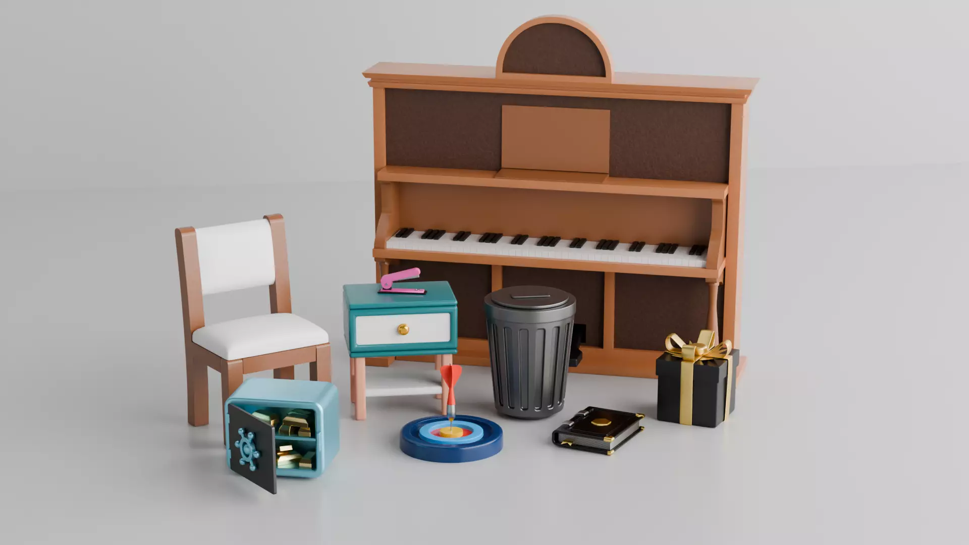 This 3D models pack includes a diverse collection of highly detailed everyday objects designed for creative projects. The pack features a wooden upright piano with intricate black and white keys, a sleek white chair with wooden legs, and a compact blue nightstand with a single drawer, topped by a pink decorative object. Additional items include a minimalist black trash can, a luxurious black gift box adorned with a gold ribbon, and a robust blue safe with its door ajar, revealing neatly stacked gold bars inside. A colorful dartboard with a dart precisely hitting the bullseye adds a playful touch, while a sophisticated black book with a gold clasp rounds out the collection. Perfect for animation, gaming, or interior design purposes, this pack offers versatility and elegance in equal measure.