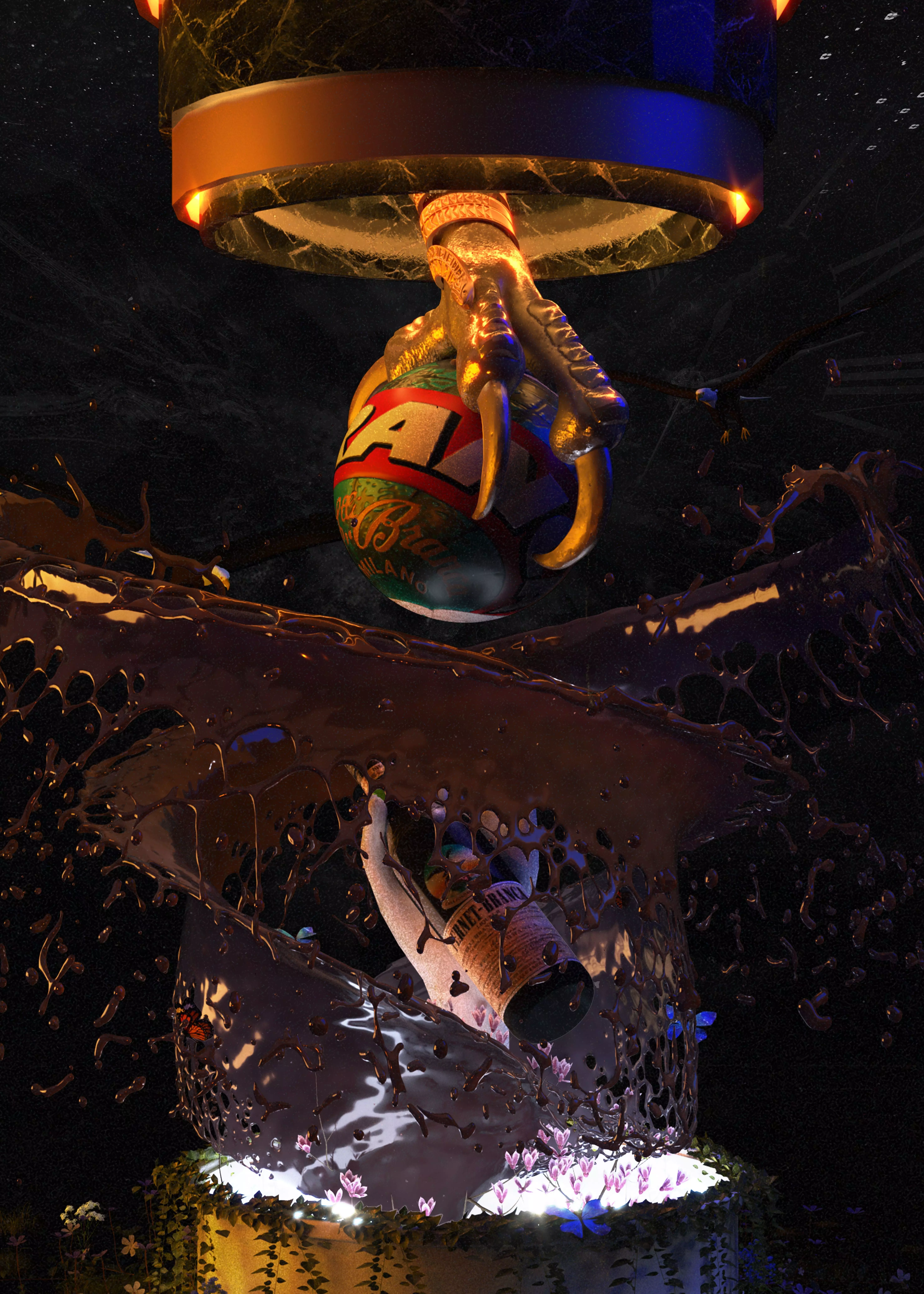 3D sculpture, a scene with various assets and models included. Hands, eagles, butterflies, bottle, liquid, claw — ideal to use as a resource repository or as inspiration for your creations.