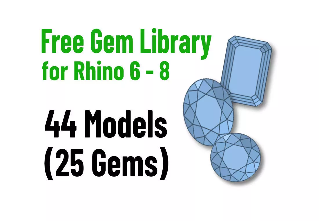 This Rhino gem library includes 47 gem models. They should work in Rhino 6 and higher. There are 7 fancy gems, 19 simple gems, and 19 gem cutters. There are also 4 cabochons and 19 gem outline curves. The fancy style includes brilliant cuts and step cuts. The simple style gems have much simpler facets than the fancy style. The cutter style is just the most basic shape of the gem and can be used to cut notches in prongs and seats in metal when necessary. NOTE: these models are only approximations to real gemstones. These models should be used cautiously when designing jewelry that will be produced. The size and shape of the actual gems that will be in the piece must be carefully considered in production designs.