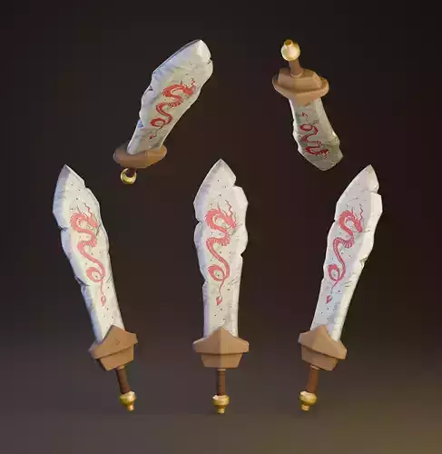 Low-poly Game ready 3D Model (2756 polygons).This is a stylized sword with a unique and artistic design. The blade is made of rough stone or a material resembling it, with uneven edges, suggesting a primitive or ancient craftsmanship. A red dragon is intricately painted or engraved along the blade, adding a mythical and cultural touch. The hilt is simple and robust, consisting of a wooden grip, a geometric guard made of a clay-like material, and a metallic pommel with a golden finish.