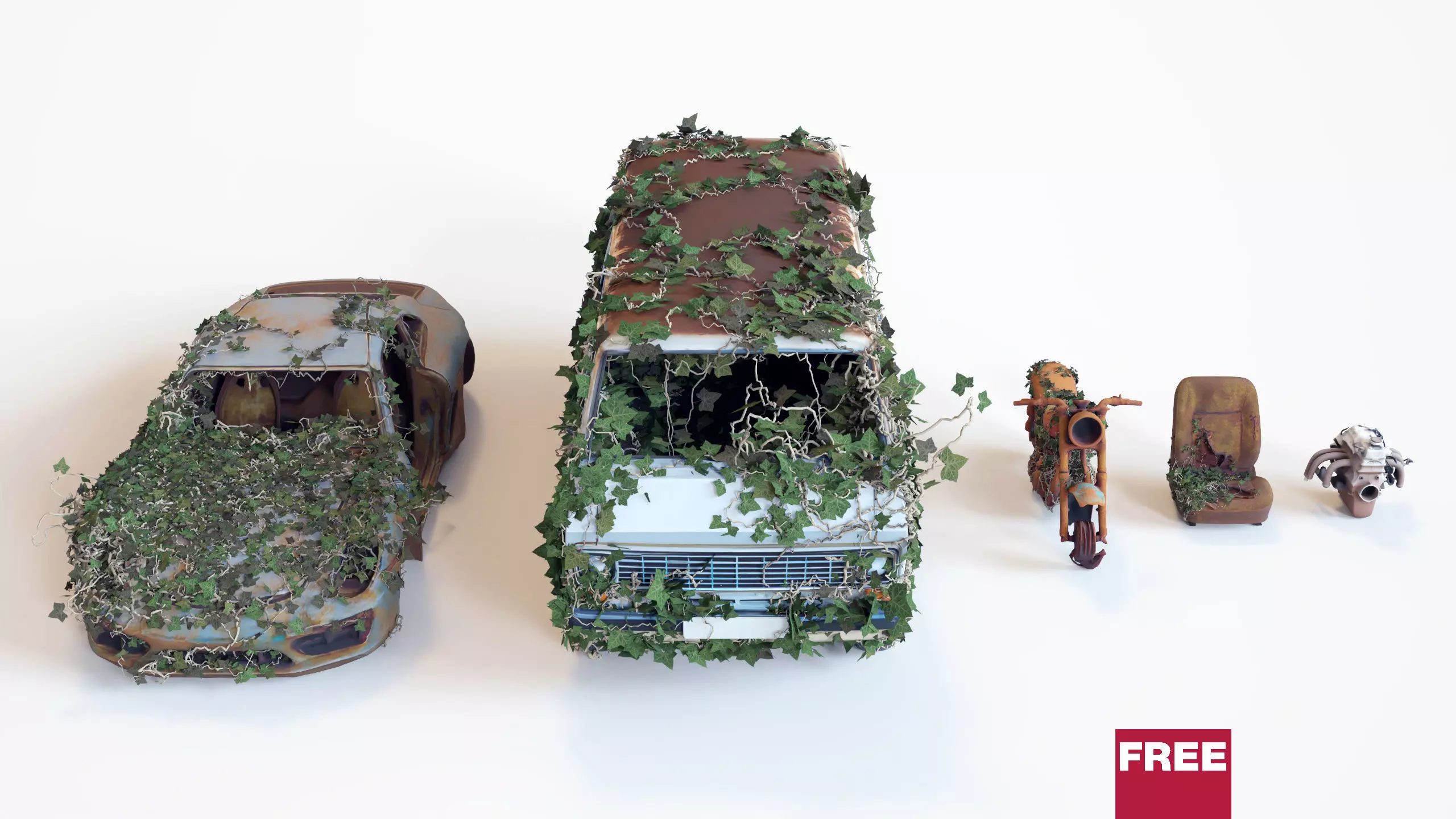post apocalyptic, abandoned cars, rusty vehicles, overgrown car, ivy covered car, abandoned van, rusted metal, urban decay, dystopian environment, survival props, destroyed vehicle, junkyard car, corroded metal, cinematic environment, realistic vehicle, game ready props, PBR materials, environment assets, derelict car, forest overgrowth, decayed vehicle, apocalypse scene, abandoned transport, old engine, damaged motorcycle, ruined city assets