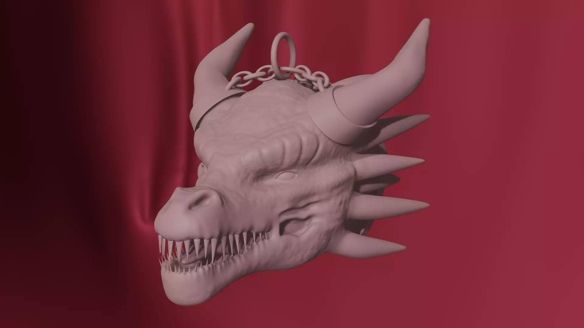 High fantasy Dragon head sculpture for keychains, necklaces or just decoration. Model is available in 3 versions. v1: hanging printable chains (print only if you want filament chains. v2: with a fixed chain so it is more sturdy. v3: with fully removed chain and collar.