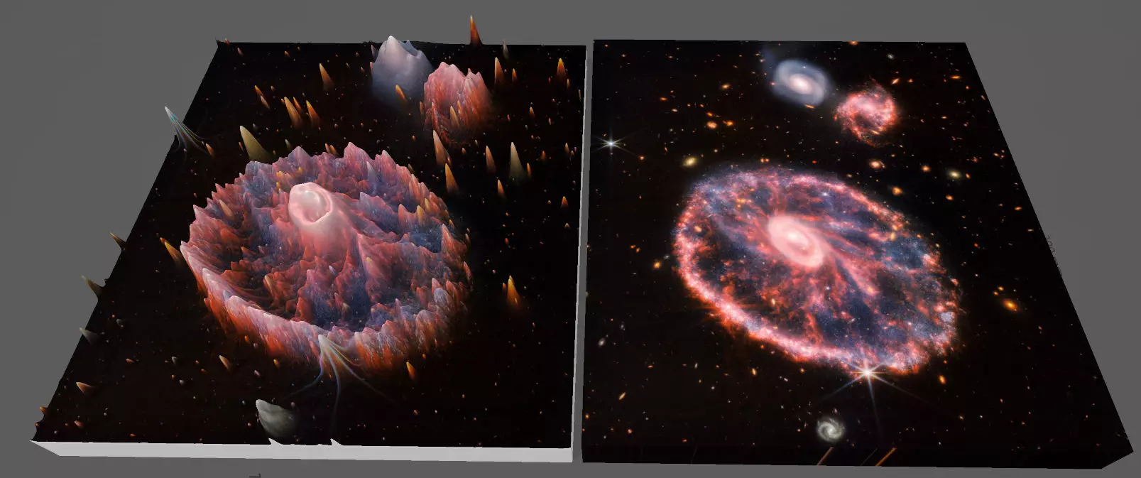 3D image obtained as a result of soft analysis of the 2D images of the new Hubble Space Telescope. The technique based on color analysis highlights the light of stars and ionized gases from the darkness of space, as gravity curves space, thus creating a spatially interpretable high-resolution 3-dimensional work.