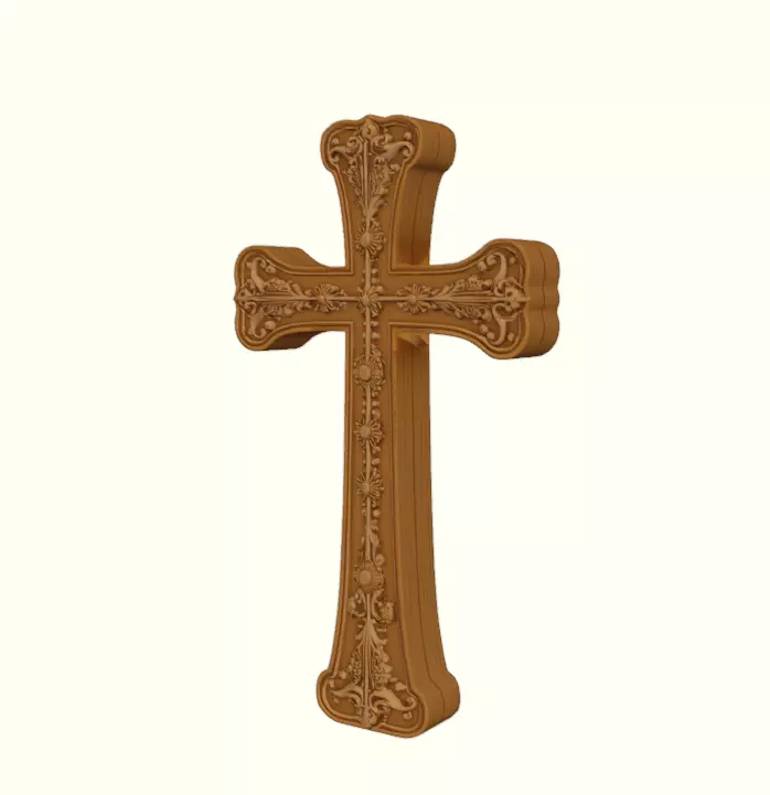 The front face carries symmetrical floral and scroll ornamentation running along the vertical and horizontal arms, framed by a raised border that helps the relief stand out after printing. The silhouette has gently widened arm ends and softened transitions, giving it a plaque-like presence. The back is flat and smooth, which suits wall mounting, panel décor, or gluing onto a base or stand. The thickness is consistent enough for practical 3D printing, and the details remain readable for painting, drybrushing, or wood-stain style finishes.