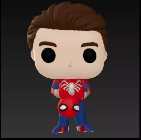Spiderman quitandose el traje funko pop.Muscular body. Menacing expression. Chibi art style. Well-proportioned. Clearly defined features. Highly detailed. Highly stylized.Walls and features are at least 2mm thick. Bold, recessed features with a depth of at least 2mm. Sharp, clean lines. Embossed features to rise at least 2mm above the surface. DND.