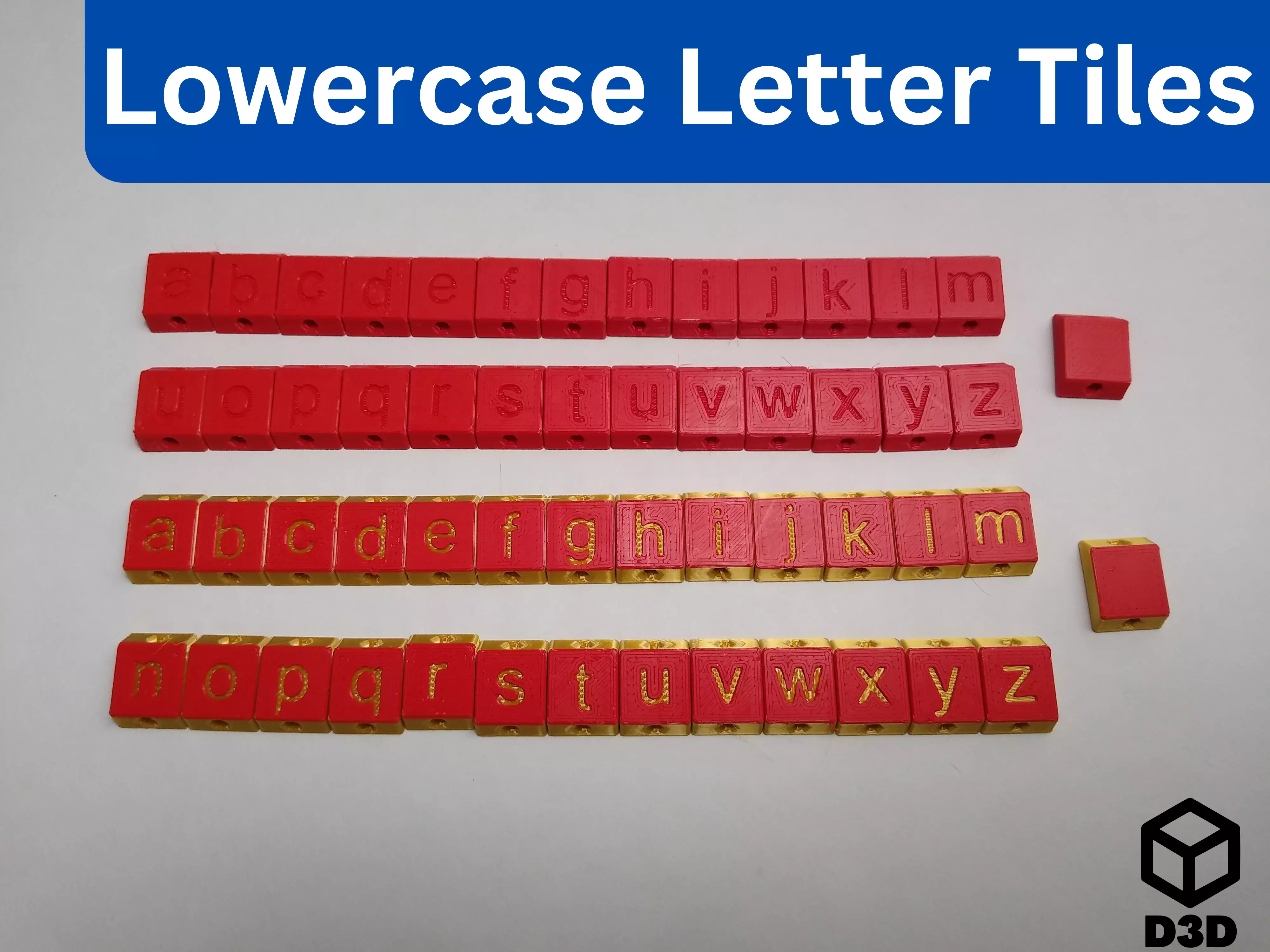 This is a set of Dovetail Tiles System compatible characters for the entire lowercase English alphabet and a space as well. These tiles can be used by themselves similarly to Scrabble tiles for artistic purposes, or they can be used in unison with other dovetail tile compatible files.