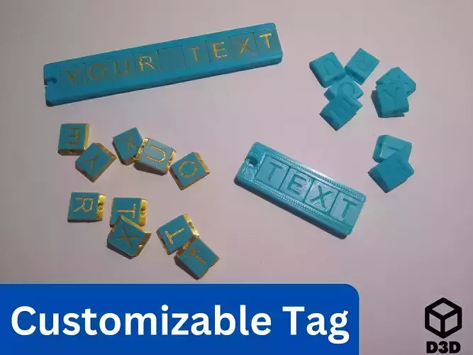 This is a 100% customizable tag. This tag can be configured into any message, that is between 1 and 10 characters long. This file only includes the English capital alphabet, as well as a space, but for more compatible characters, you can visit the Dovetail Tile System collection. The different letter tiles give the tag a scrabble feel, as well as making the tag completely customizable. This tag can also be changed to different text later due to the removable pin that keeps the letters in. Although, depending on the tolerance of your printer, you may need to use an Allen key or something of that sort to get the pin out.