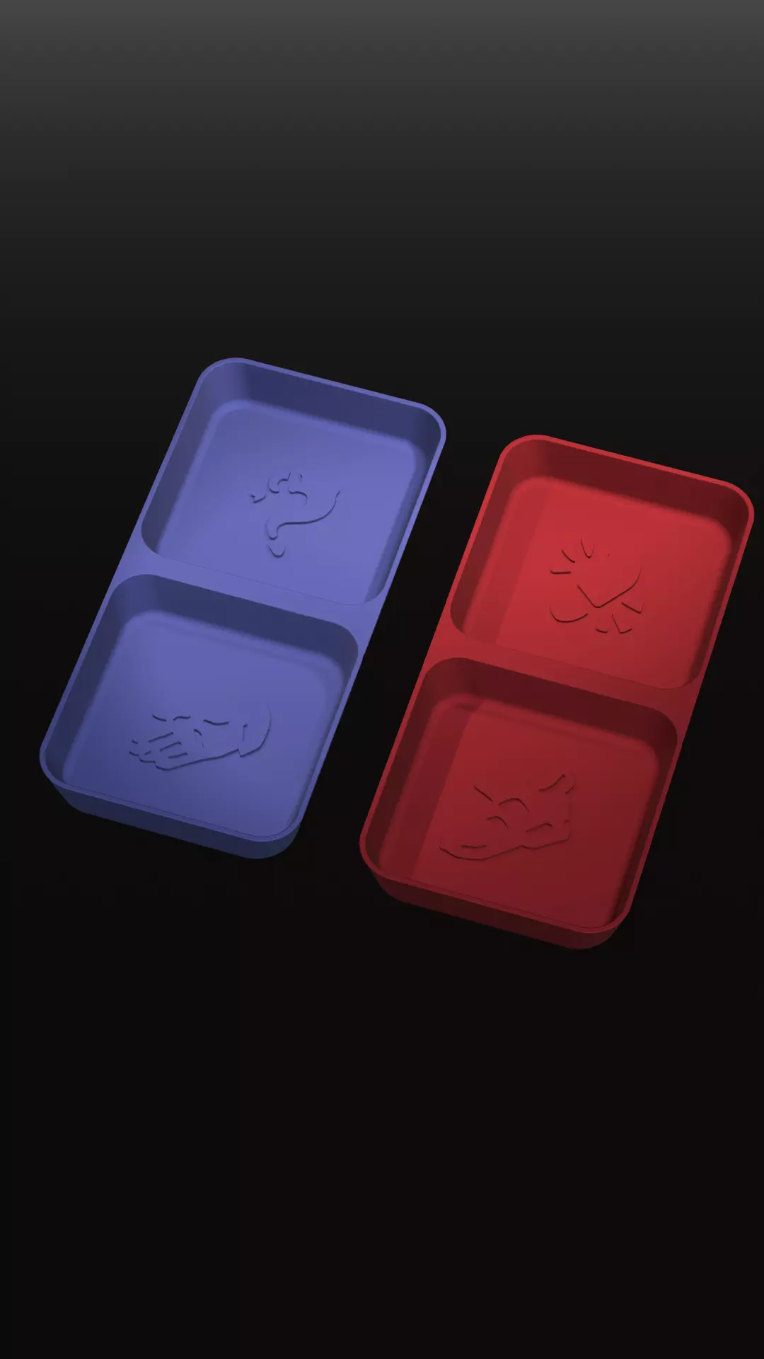 TOKEN TRAYSToken trays for each player depict the respective token icons for each player and are downloadable as one-piece double tray sets. Icon images on the bottom of the trays are based on the wooden token sets available from the game maker but work equally as well for the base game cardboard tokens.