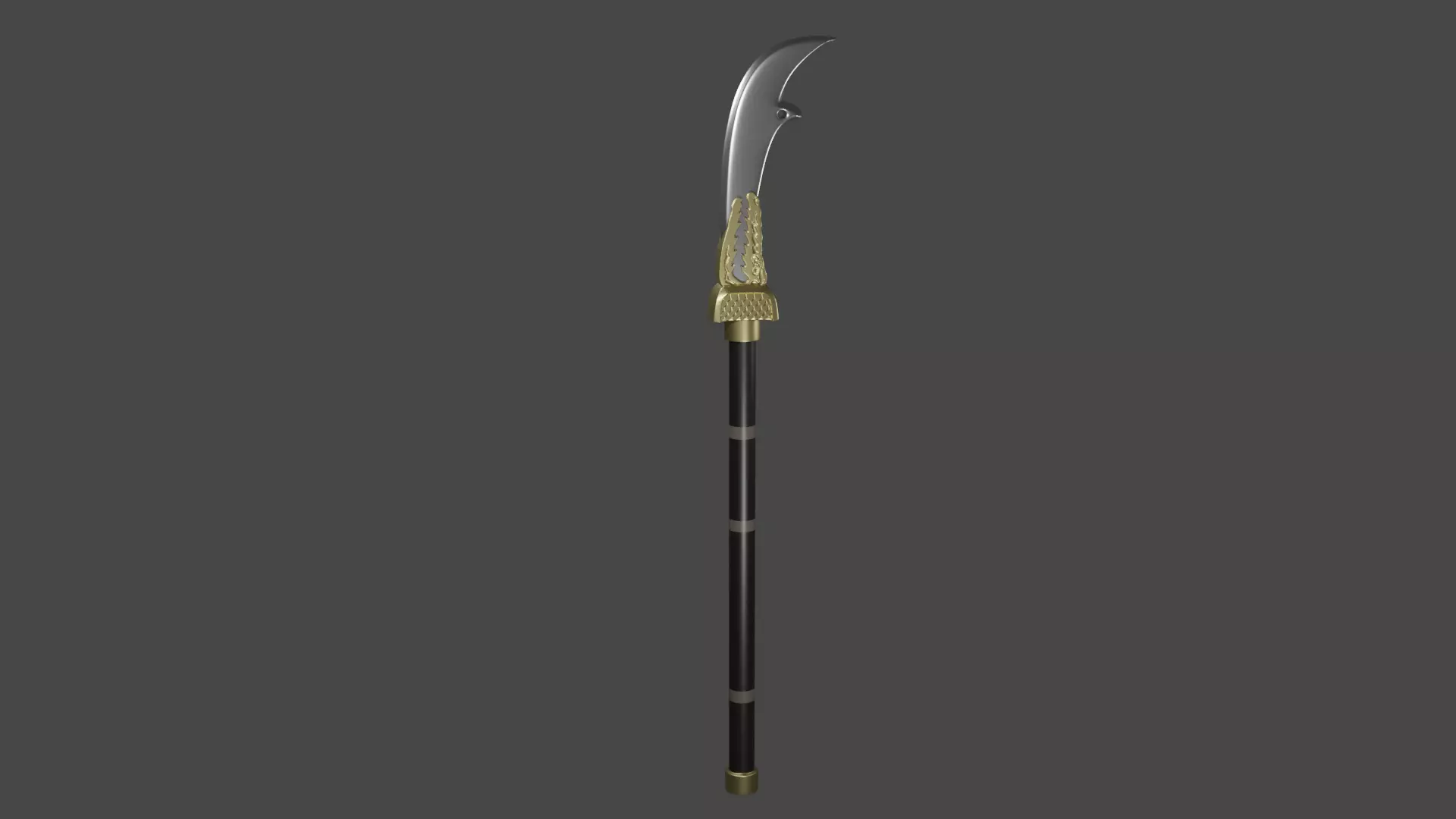 Woldo 월도 - Korean Moon Glaive. The woldo is a powerful polearm that is named for its crescent moon shaped blade. This design features a decorative Yeongno face at the base of the blade. Yeongno are creatures known for eating corrupt rich yangban aristocrats.