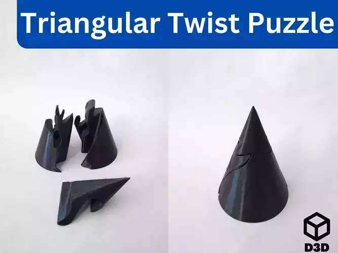 This is a triangular twist puzzle. This is a relatively easy puzzle to solve. The objective of the puzzle is to assemble the three pieces into a triangle. The puzzle should be able to be assembled with little to no force exerted onto it, in other words, if you have to shove the puzzle that orientation is probably not the correct solution.