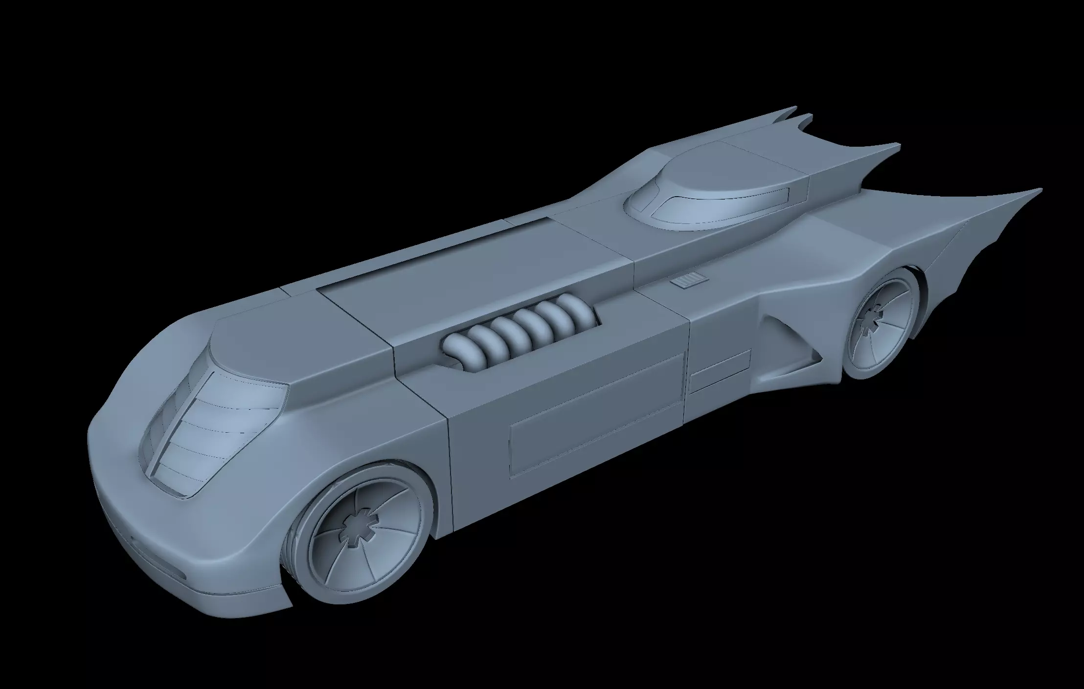 Based on the car depicted in the 90s animated Batman series, this Batmobile has been designed in several pieces. Print the body parts, 4 tires, and one of each axle. Then simply slip the axles through the body, screwing the tires onto the axle ends to hold then together. Screw the front and rear body ends together. They are designed to twist together easily, if cleanly printed.