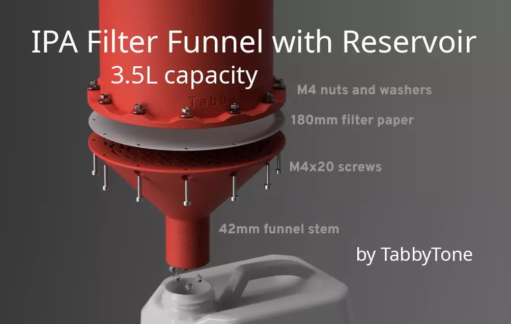 IPA (isopropyl alcohol) Filter Funnel with 3.5L Reservoir and 42mm Stem.For filtering contaminated IPA (isopropyl alcohol) when 3D printing with a SLA (resin) printers.