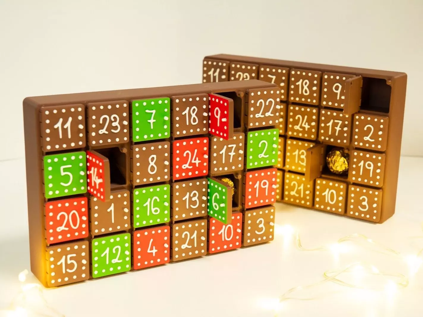 A fully 3D printable Christmas Advent calendar with 24 hinged windows inspired by gingerbread cookies, ready to deliver 24 tiny moments of joy.