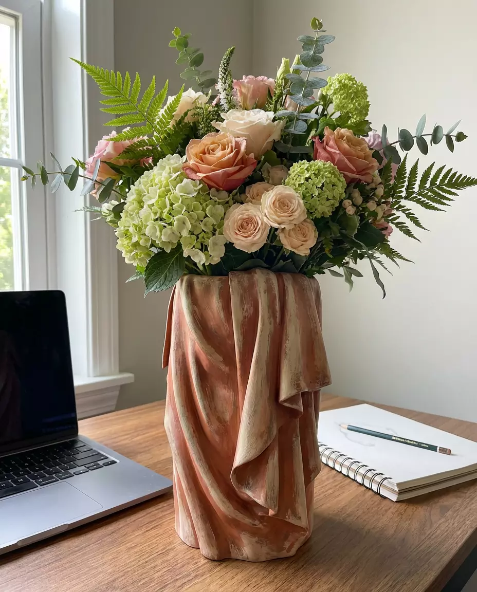 An illusion of softness. This 3D printed vase mimics the look of draped fabric found in classical marble statues. The folds and creases create a stunning interplay of light and shadow. Elegant home decor.