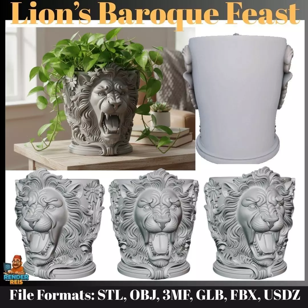 For custom designs, feel free to contact me.This majestic model can serve as a pen holder, vase, or decorative container, combining both strength and elegance in the Lion’s Baroque Feast design. The roaring lion’s face contrasts dramatically with the intricate Baroque-style floral and leaf carvings surrounding it. It is a perfect project for 3D printing enthusiasts who value artistic detail and high-quality surface finishing.