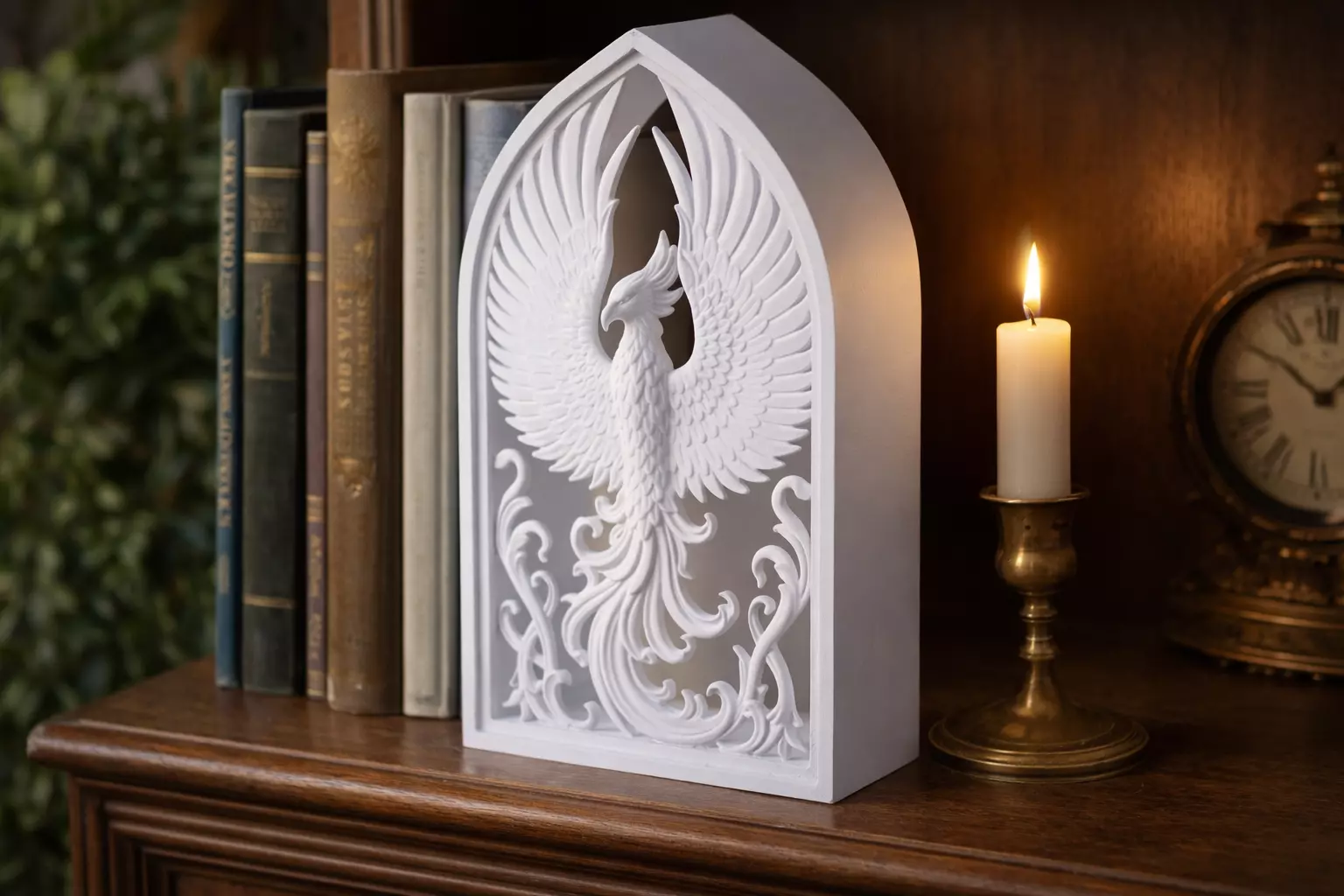 Meet this phoenix captured inside an arched “window,” made to live between your books like a hidden portal on your shelf. The wings spread wide in layered feather relief, the body rises in a strong vertical line, and the tail flows down into ornate curls like smoke or fire turned into sculpture. It’s dramatic, detailed, and surprisingly elegant — fantasy decor that still feels clean and modern.